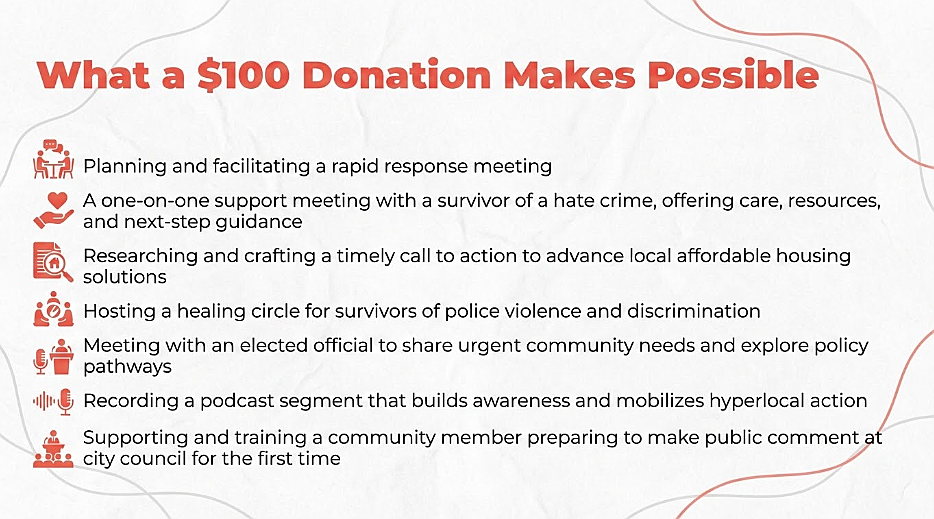 We appreciate any and all donations! AND, we have a goal of reaching 26 donors contributing $100 or more monthly to provide sustained support. At the end of the year, we'll have a special acknowledgement for this unique group of supporters whose recurring gifts help us plan, act, and grow with confidence.