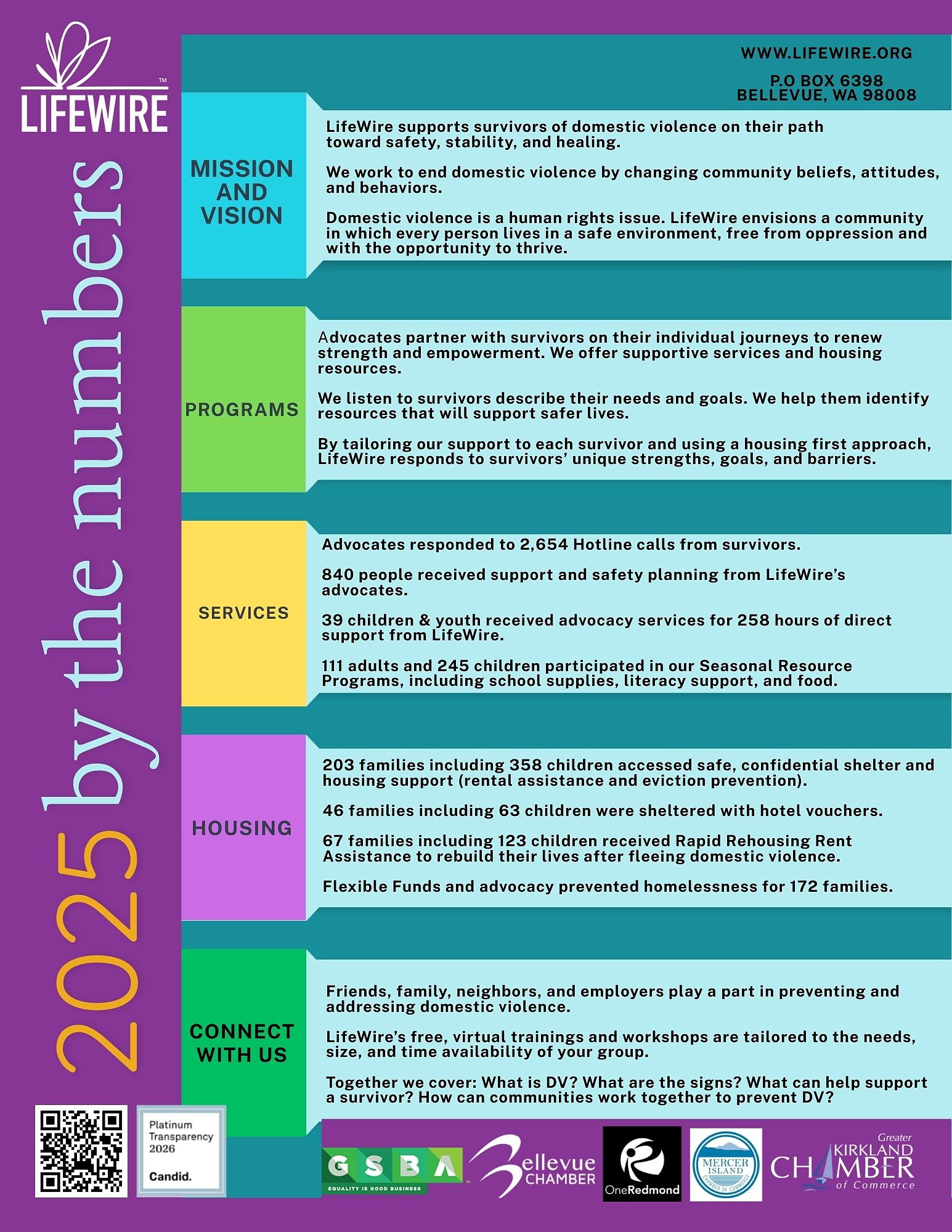 LifeWire is a leading provider of shelter and services for survivors of domestic violence in Washington State. Since our founding in 1982, we have reached over 176,000 survivors with safety, stability, and healing. In 2025 alone, we supported nearly 7,000 survivors across ten counties in beginning safer, brighter chapters. We are committed to changing social norms through free prevention trainings for communities ready to make a difference.
