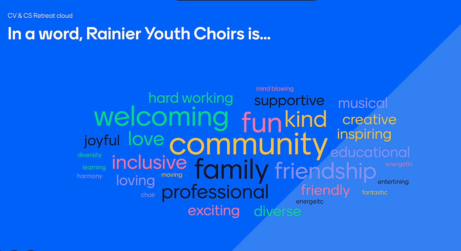 Members come from many different communities surrounding Covington, including Auburn, Burien, DesMoines, Enumclaw, Federal Way, Issaquah, Kent, Maple Valley, Renton, et al. Many of these communities' school choir programs have been reduced or eliminated resulting in a void for which Rainier Youth Choirs was created to help fill.