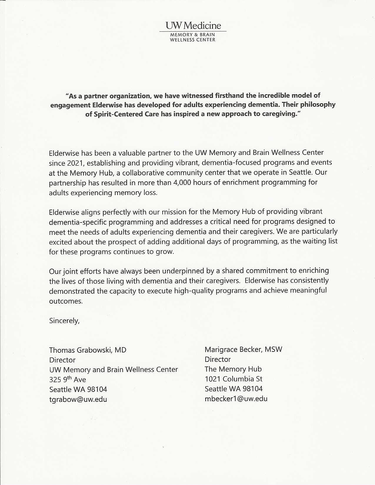 We have seen the positive results the Elderwise programs have on individuals and families navigating the reality of living with dementia. Our intention is to make the Elderwise approach of Spirit-Centered Care® and therapeutic enrichment a part of the standard care for all adults living with dementia. We are confident in the quality of our approach having won two national caregiving awards in the past two years: the Family Caregiver Alliance Award for Innovations in Alzheimer’s Caregiving in Creative Expression, 2021 and the Maude’s Award for Innovations in Alzheimer’s Care in Supporting Care Partners, 2022.