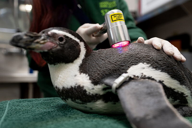 Sloth bear mom Kushali was diagnosed with epilepsy in 2025. After her care team observed her having seizures, Woodland Park Zoo partnered with a veterinary hospital with an MRI machine to examine and diagnose her condition. Thanks to the support of our zoo community, she receives daily medications to keep her comfortable and seizure-free. A Humboldt penguin receives laser therapy.