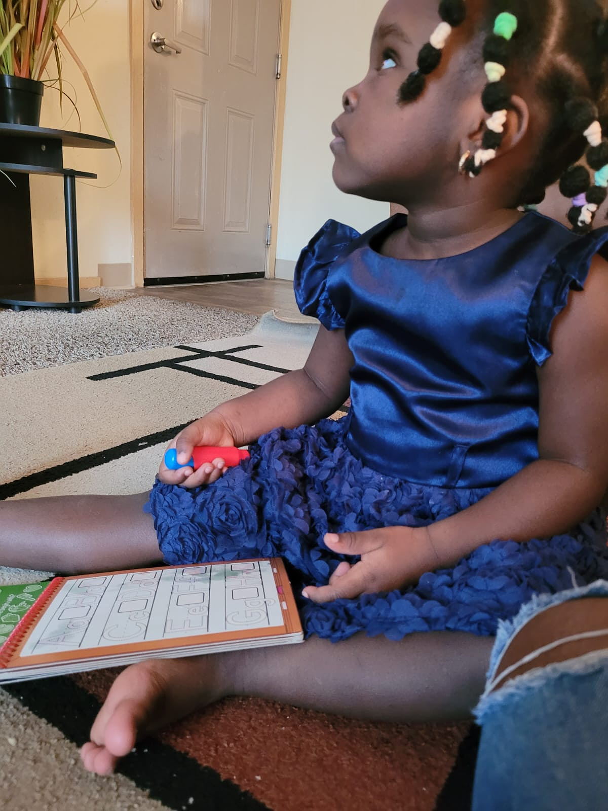 A toddler in Kent learns to read in both English and Lingala, preparing for school and maintaining identity.